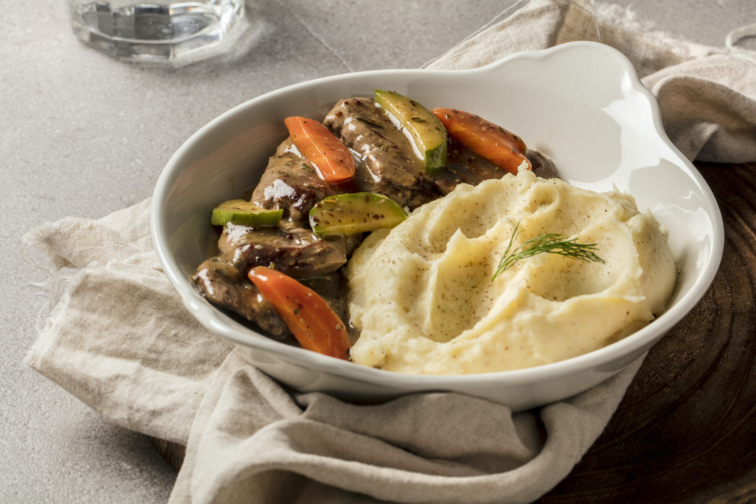 Filet meat , Boiled zucchini and carrots , puree served with sauce biftek