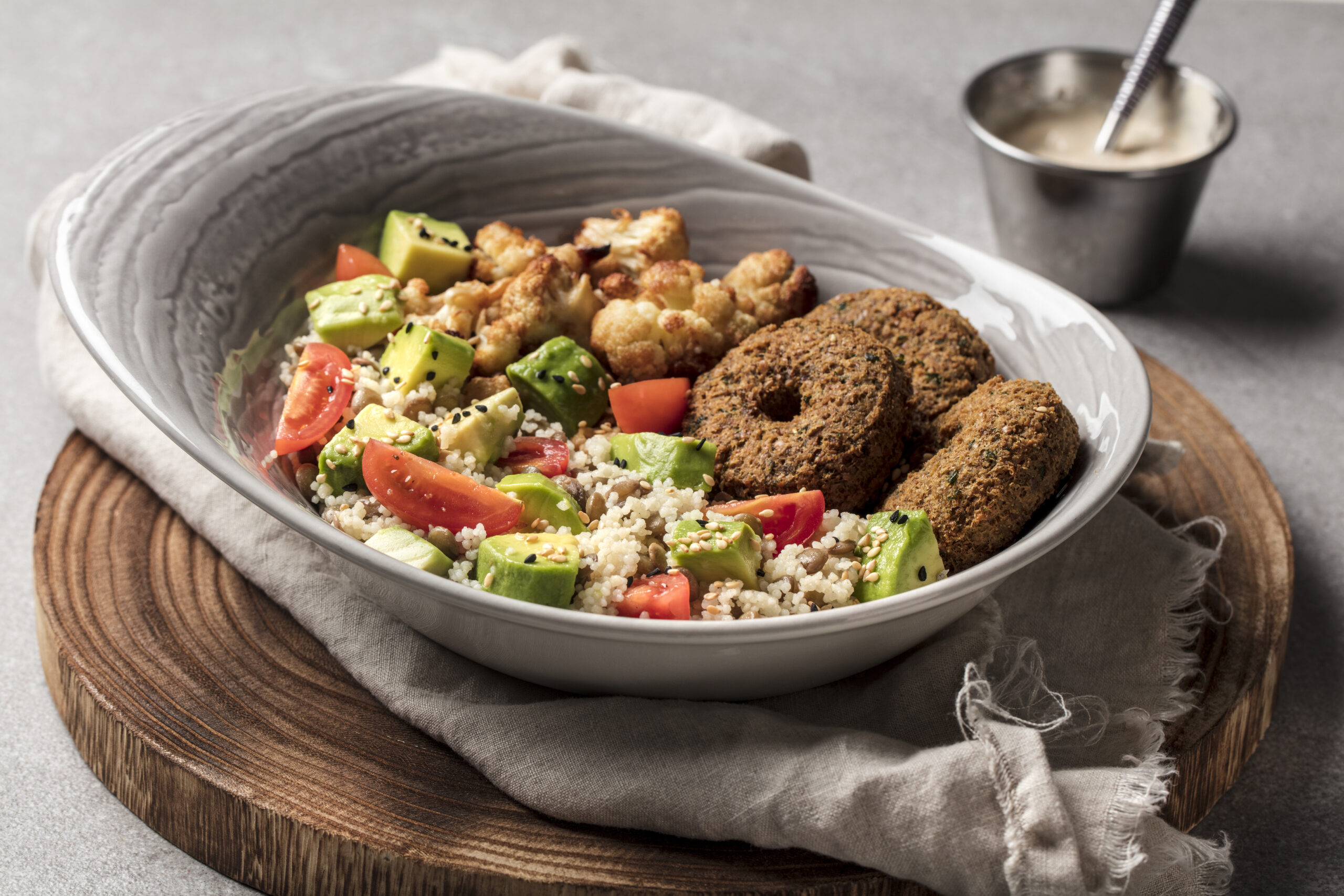 Couscous, lentil, cherry tomato, avocado, chickpeas, white sesame and fried falafel served with homemade specialty taratour dressing