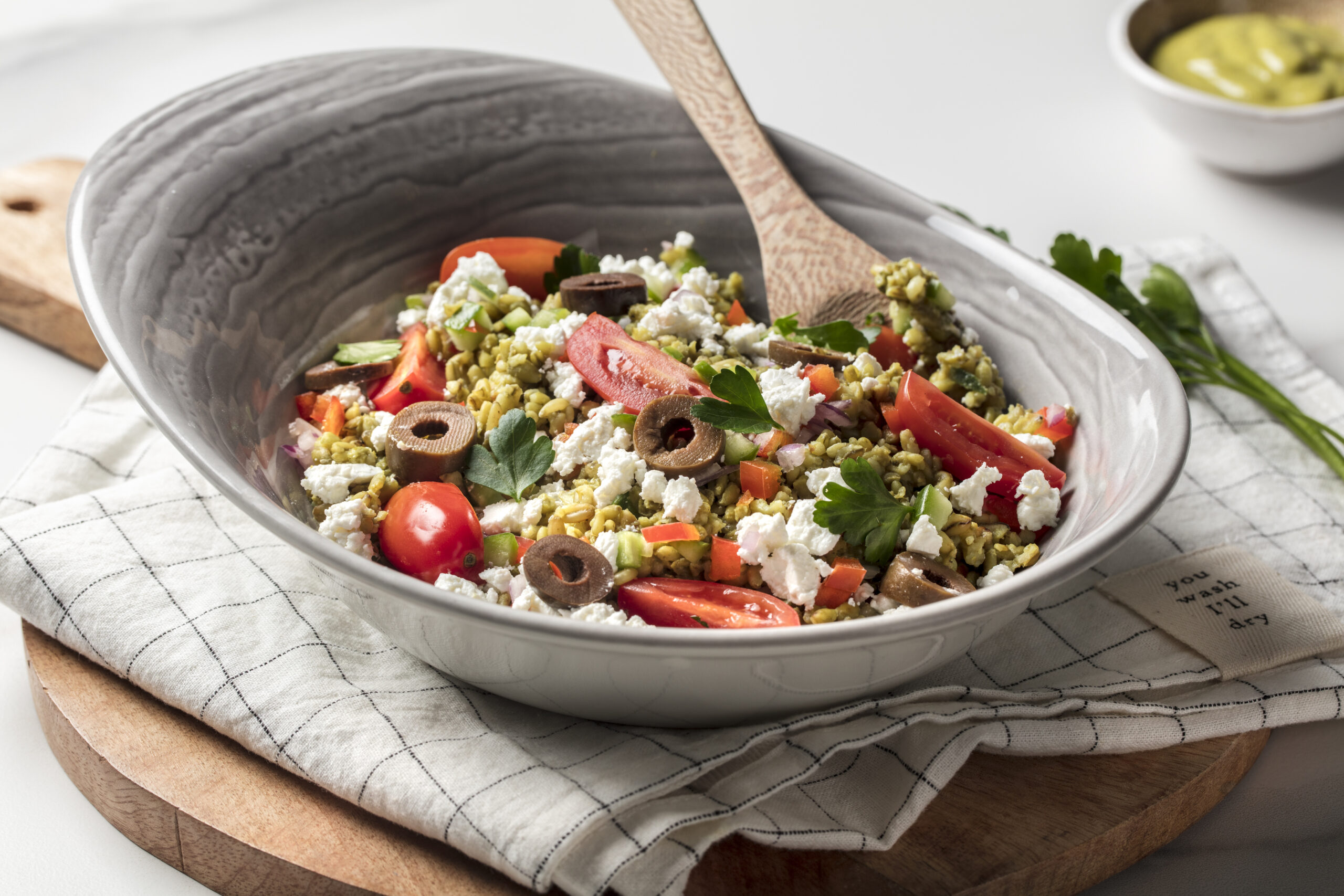 Freekeh, parsley, cherry tomato, red onion, cucumber, red bell pepper, black olives and feta cheese with our homemade mustard dressing
