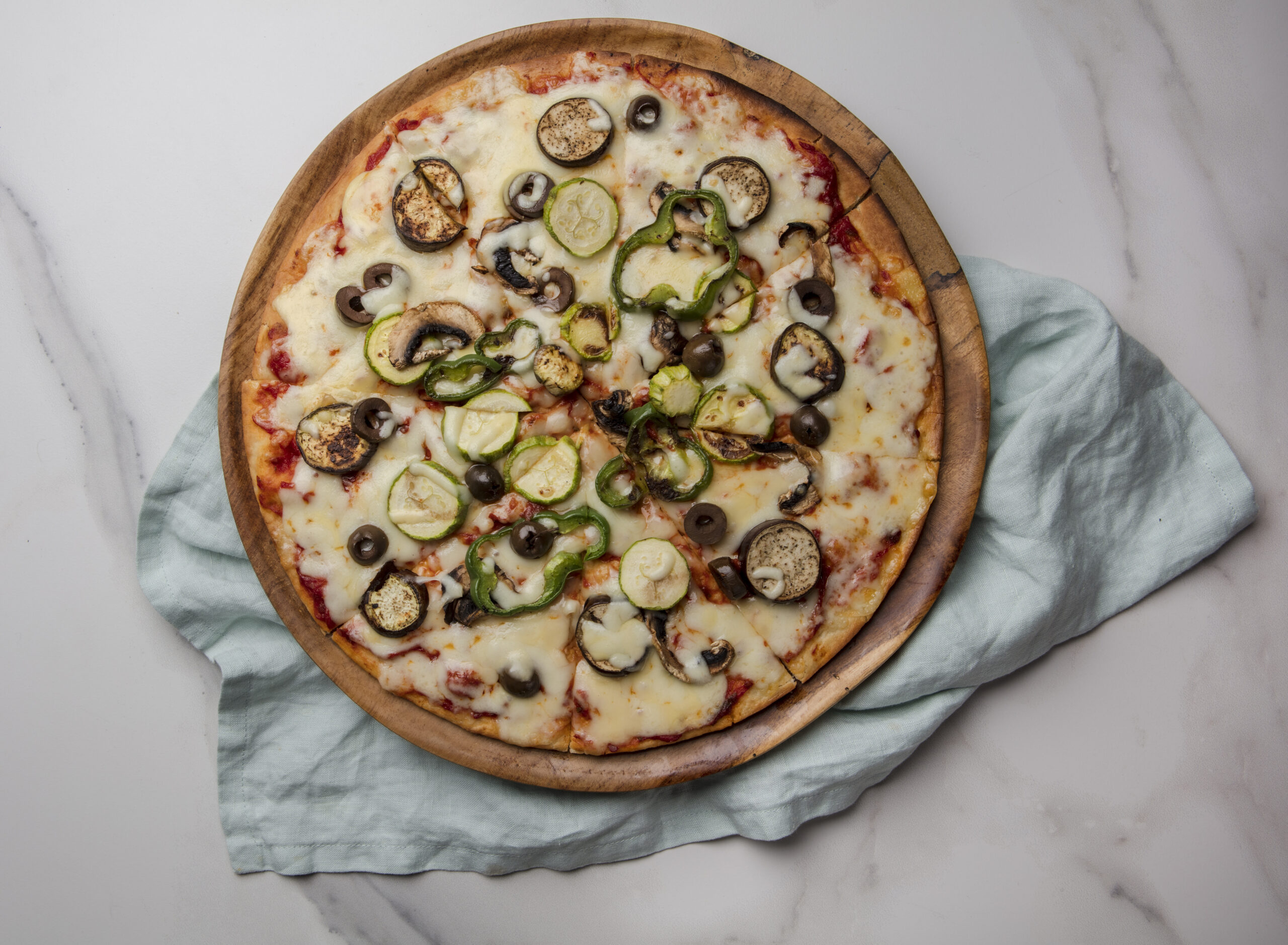 Sauce pizza, oregano , mozzarella cheese , zucchini , green pepper , eggplant , olives and mushrooms