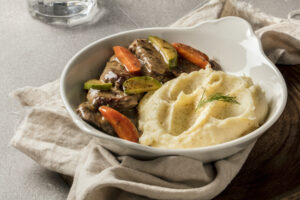Filet meat , Boiled zucchini and carrots , puree served with sauce biftek