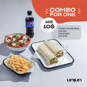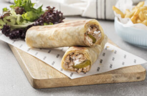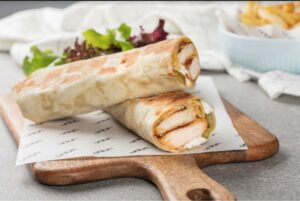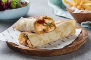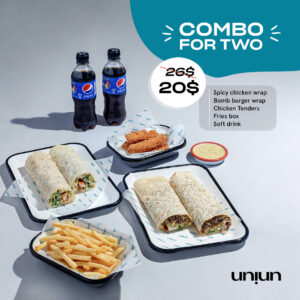 Spicy chicken wrap, bomb burger wrap, chicken tenders, fries box, soft drink