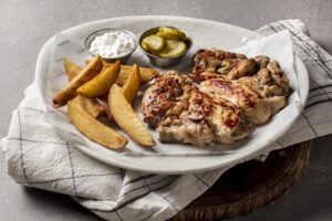 Grilled half chicken served with a side of garlic, pickles and potato wedges
