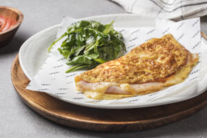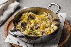 3 Eggs mixed with green onions, mushrooms served with hot bread and side mixed greens.
