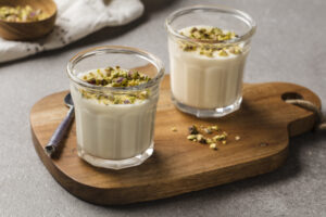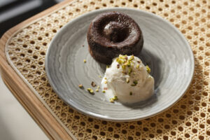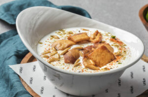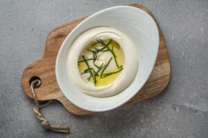 Creamy blended chickpeas topped with mint and lemon oil , served with hot bread