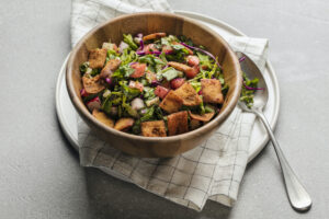 Purslane, red bell pepper, rocket leaves, radish, spring onion, cucumber, tomatoes, red cabbage, lettuce and homemade crisps served with pomegranate dressing