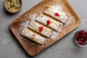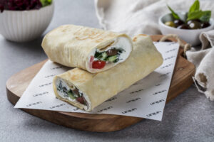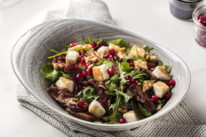 Grilled halloumi, marinated eggplant, walnut, basil and pomegranate served with our specialty pomegranate garlic dressing