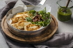 Grilled halloumi topped with pesto sauce, cherry tomatoes and Rocca
