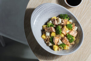 Organic brown rice, broccoli, sweet potato, mango, seared salmon with our twisted teriyaki sauce