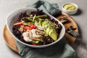 Avocado with asparagus, lettuce, fresh mushrooms, and walnut, red bell pepper, mixed sesame, dried fig and ginger served with our homemade avocado dressing