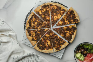 Kafta topped with seasoned potato, grilled tomato, onion and green bell pepper