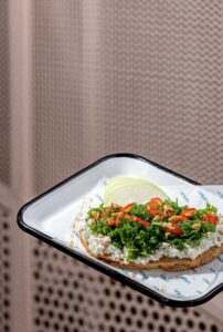 Toast campagne topped with fetta cheese , kale , walnuts , cherry tomatoes and honey.